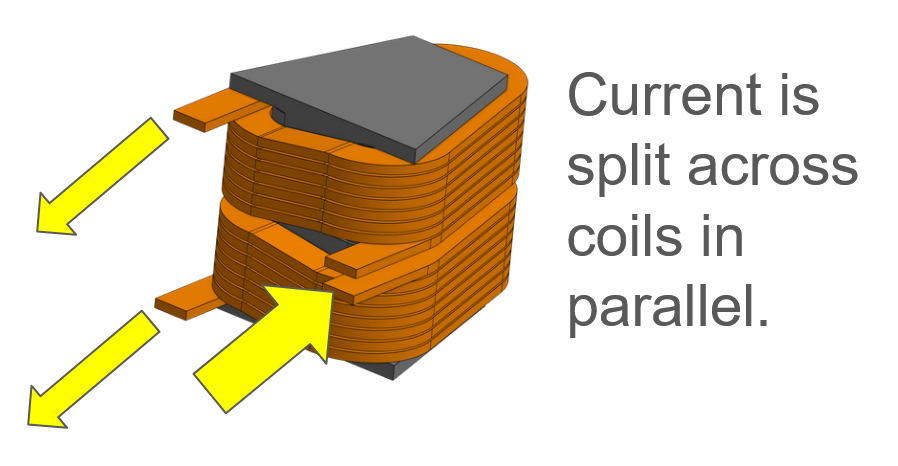 I rectified this with another unconventional motor topology: phase coils in parallel. In my motor, each segment of the stator consists of two coils on two half-teeth. These coils share the total current (only 100A each) so they can be made from 4 x 1mm rectangular wire. The total current still passes through 8mm^2 across both the coils, but since each conductor is thinner, the skin effect is much less of an issue. Additionally, the thinner conductors are easier to bend into the necessary triangle shape. They have a smaller minimum bend radius meaning the triangles have sharper points, a larger enclosed area and can thus capture more flux, leading to more torque. Thinner coils are cheaper too.