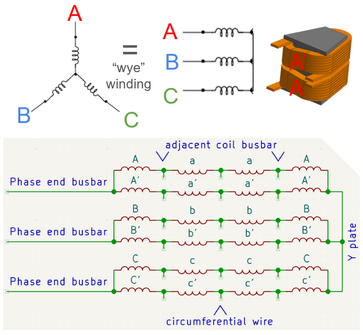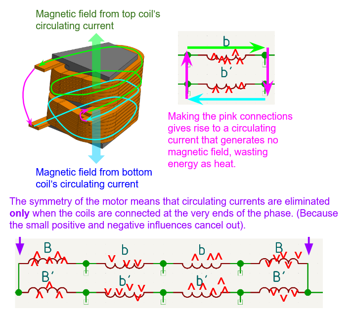 It’s very tempting to directly connect the two coils in each segment together to simplify the wiring. But, in this arrangement the subtle voltage difference will give rise to a circulating current that would cause excessive heating in the motor and significantly reduce how much power it can handle.