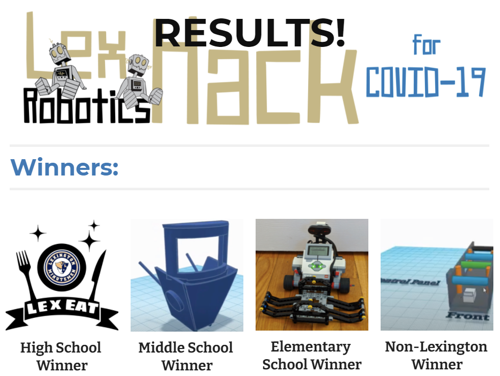 The submissions that we received included package-disinfecting robots, new face shield designs, apps to coordinate remote learning, games to encourage social distancing, and more. More details about the hackathon are visible on the website we created: https://sites.google.com/lexingtonma.org/lexhack2020/