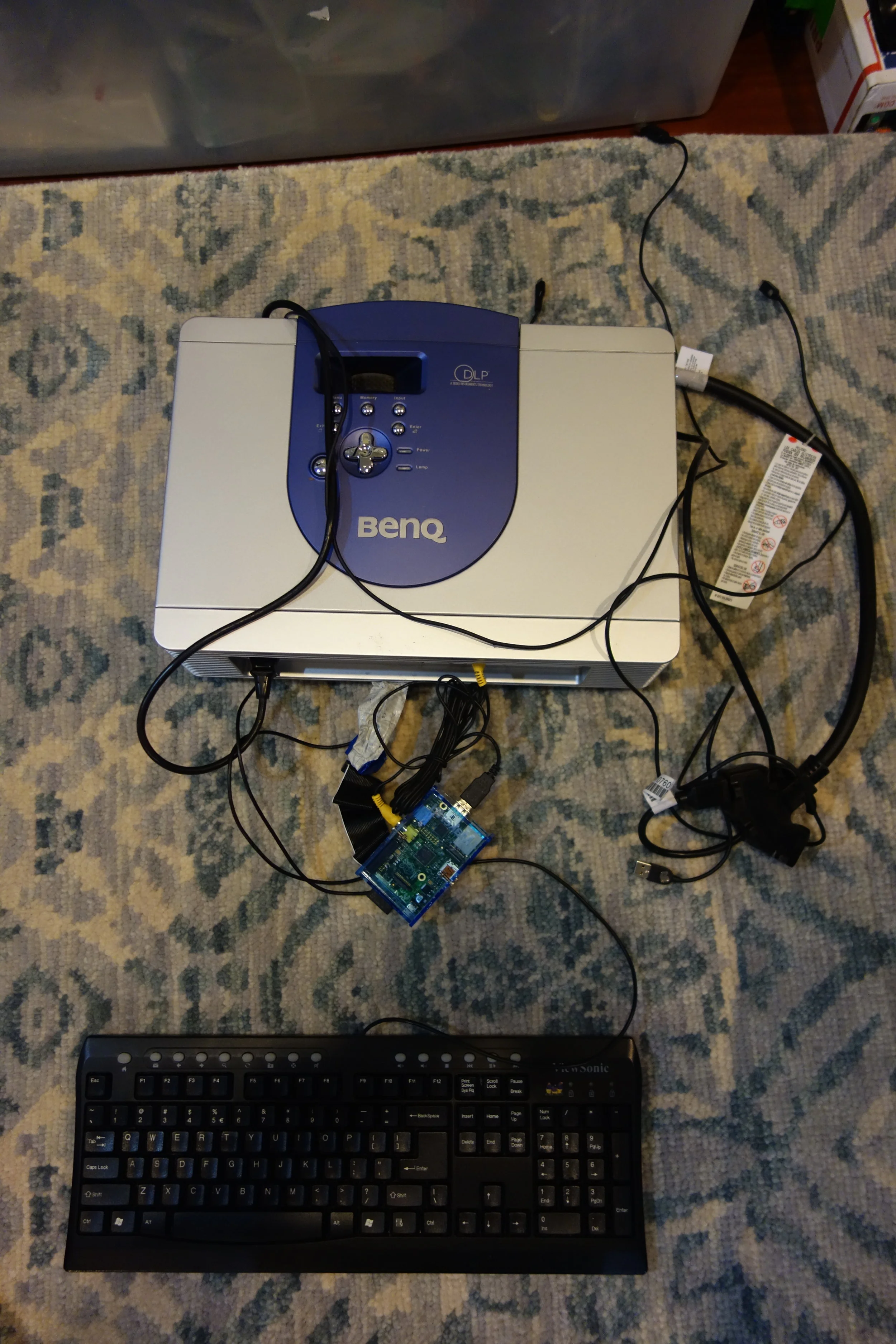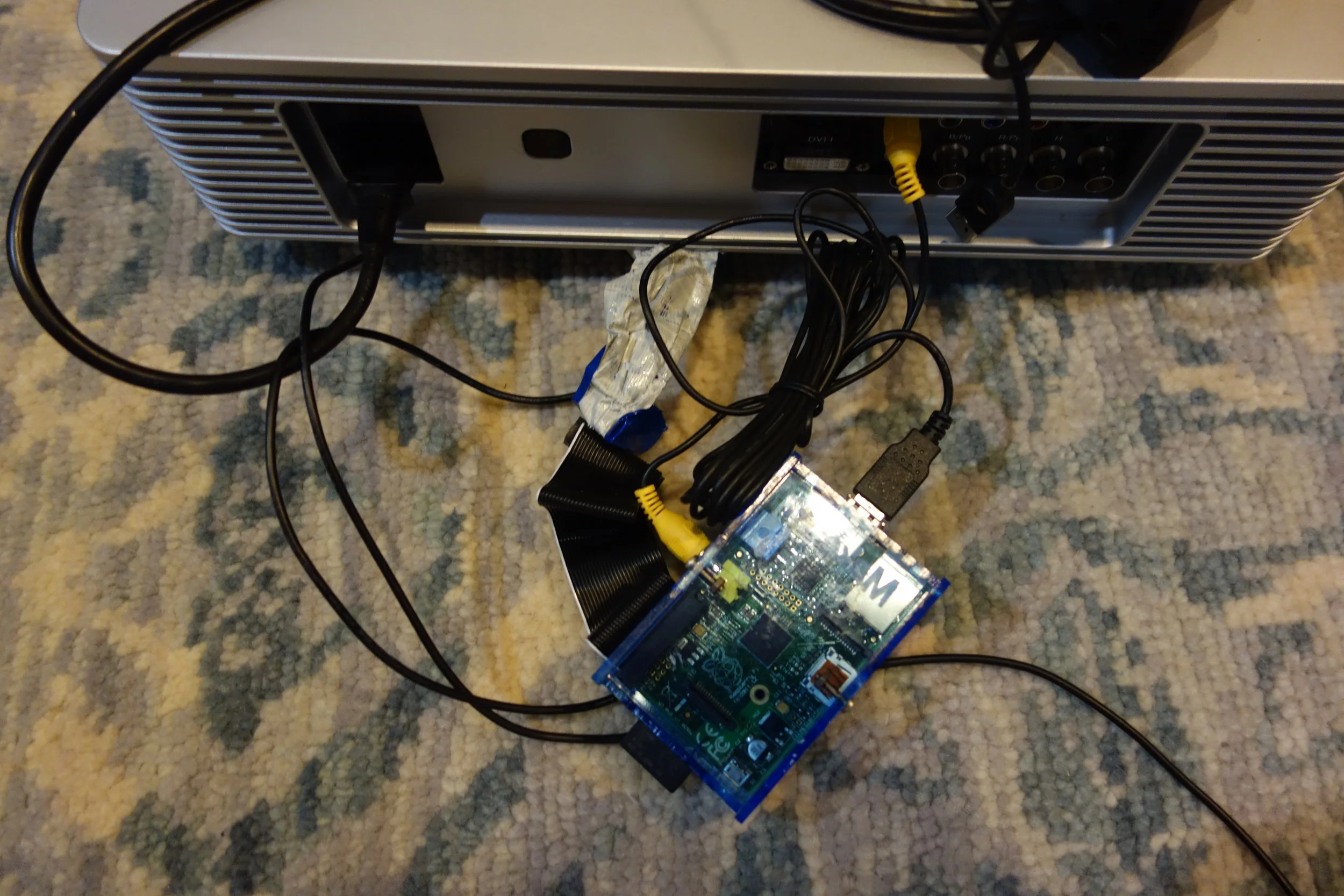 For our halloween decorations in 2016, I decided to do a "House Projection". The projection consists of a video playing on the front of the house showing ghosts flying through the windows, zombies crawling up the walls, etc. To make it as inexpensive as possible, I used a raspberry pi to play the video, a cheap bluetooth speaker and an old BenQ projector we had lying around the house. The video was made in iMovie.