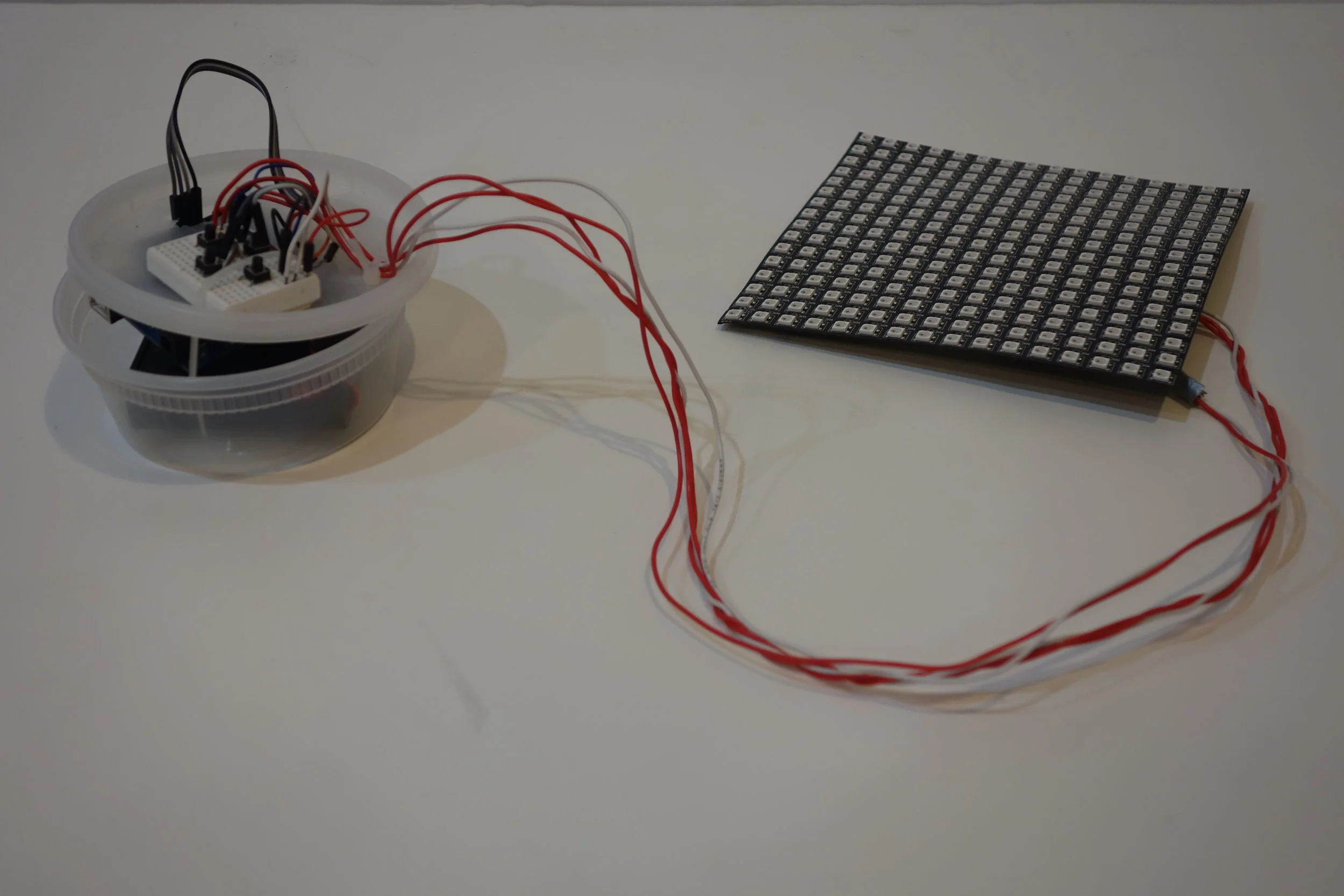 This the shirt I wore to my school’s science fair May 2016 and for Halloween 2016. Sewn into the front is a 16x16 RGB LED matrix display with 256 individually addressable full color LEDs. In the container is a 4 AA battery pack, On/Off switch, arduino uno, and solderless breadboards with 4 buttons and supporting circuitry. The Arduino is running my own version of the “snake” game which is displayed on the shirt. The game has all of the features including of the computer version. The player wins when the snake becomes 8 pixels long.