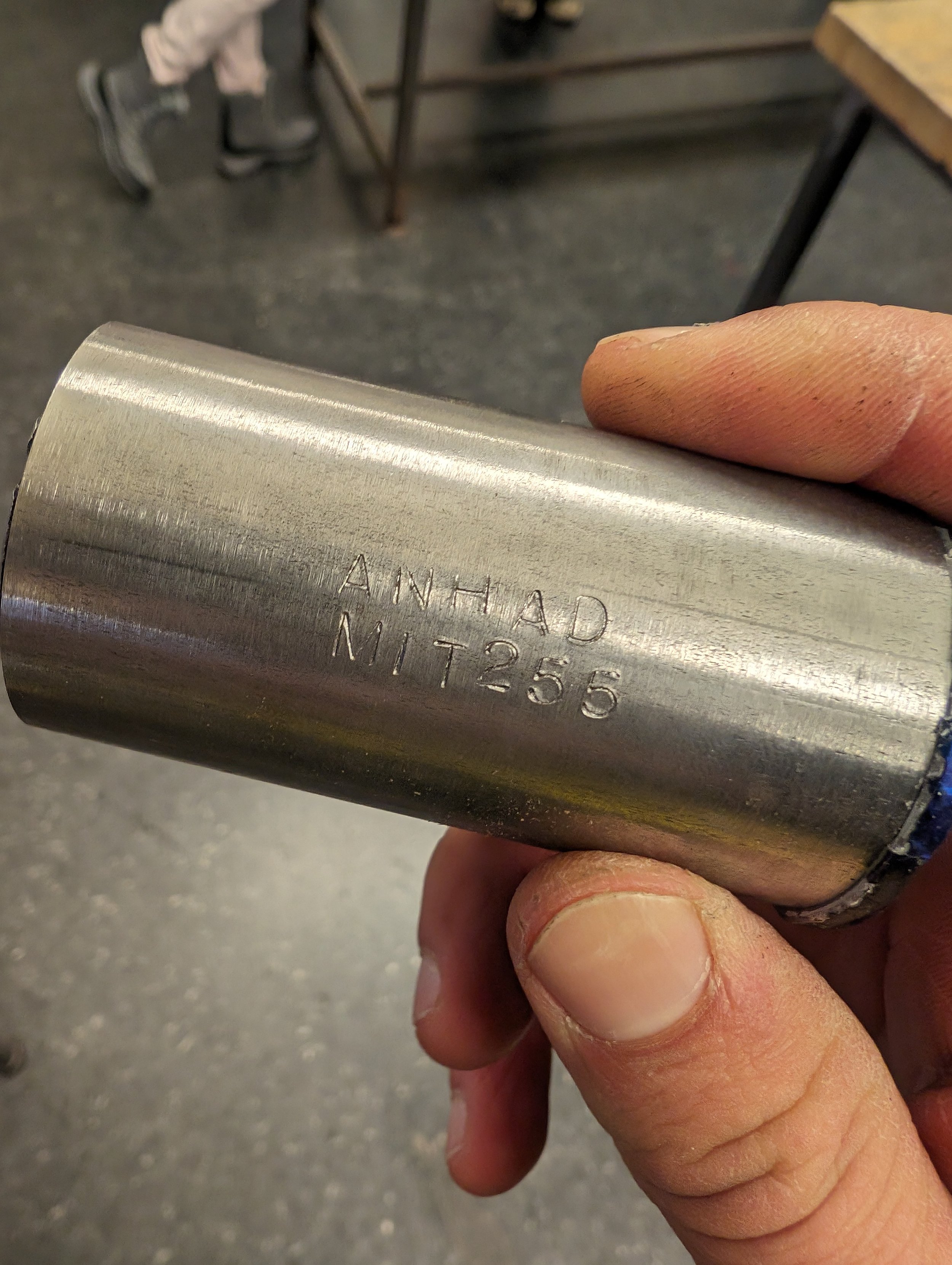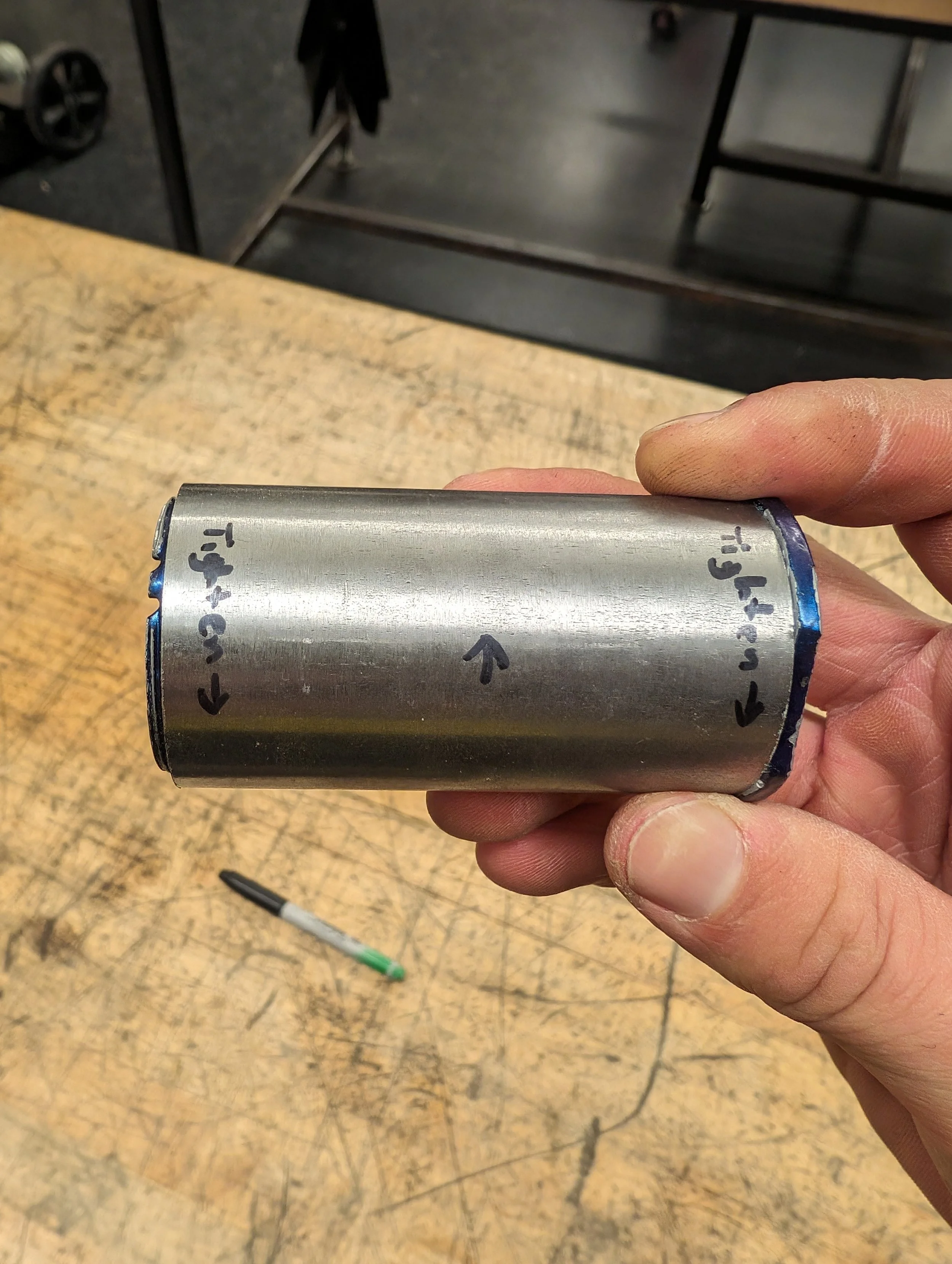 The class began by taking everyone’s measurements for laser cutting the tubing to make the frame. After receiving all the tubing, we ground and cleaned the ends to prepare for welding, and cut threads into the parts that needed to have mechanical components fitted to them. Next, everything was positioned in a jig and tacked together with small bits of weld. Once everything was tentatively held together, I then spent many hours doing the full welds all around each joint between all the tubes.